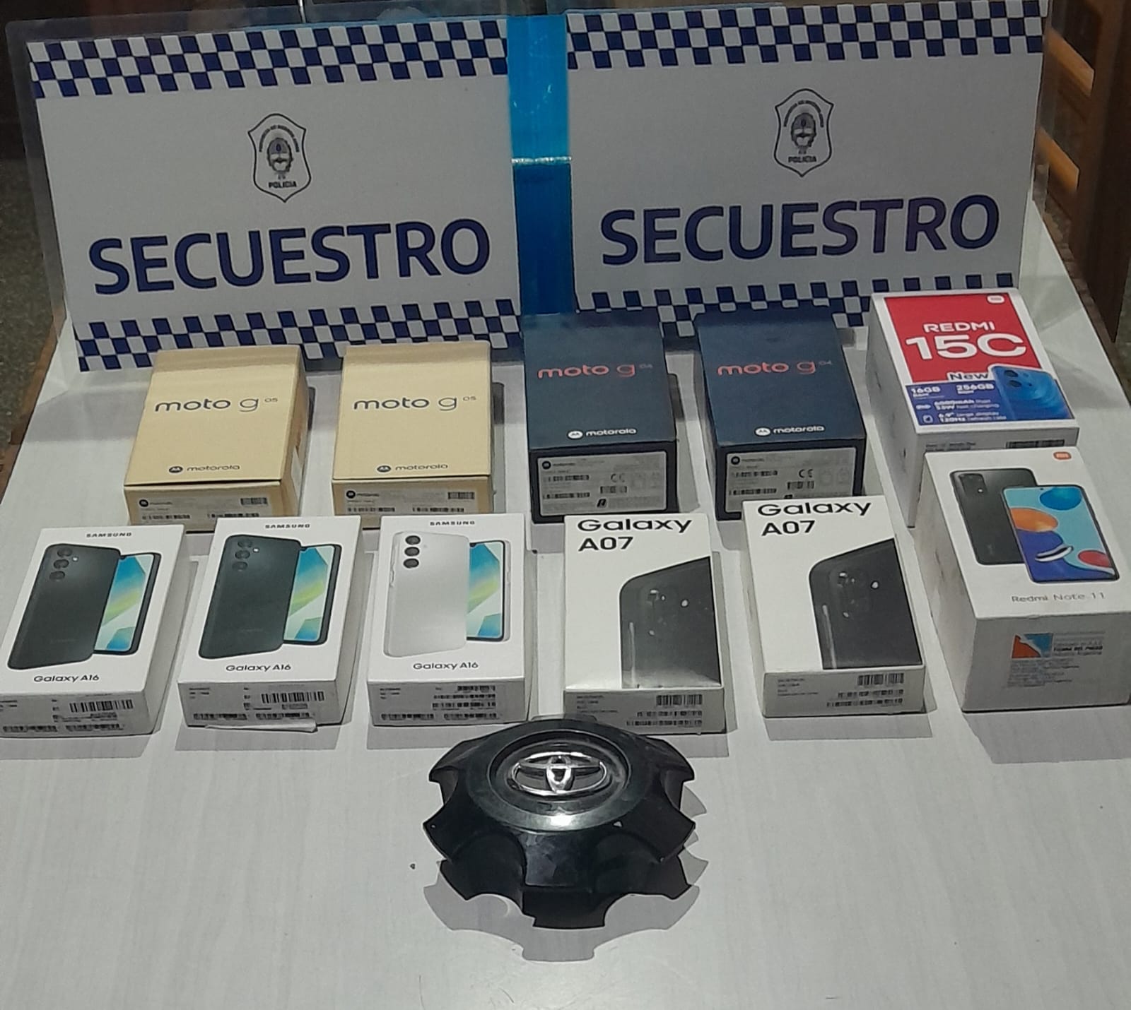 - Se incautaron 11 teléfonos celulares nuevos en caja, autopartes de la marca Toyota y una motocicleta Zanella 125 que registraba un pedido de secuestro activo por robo agravado.