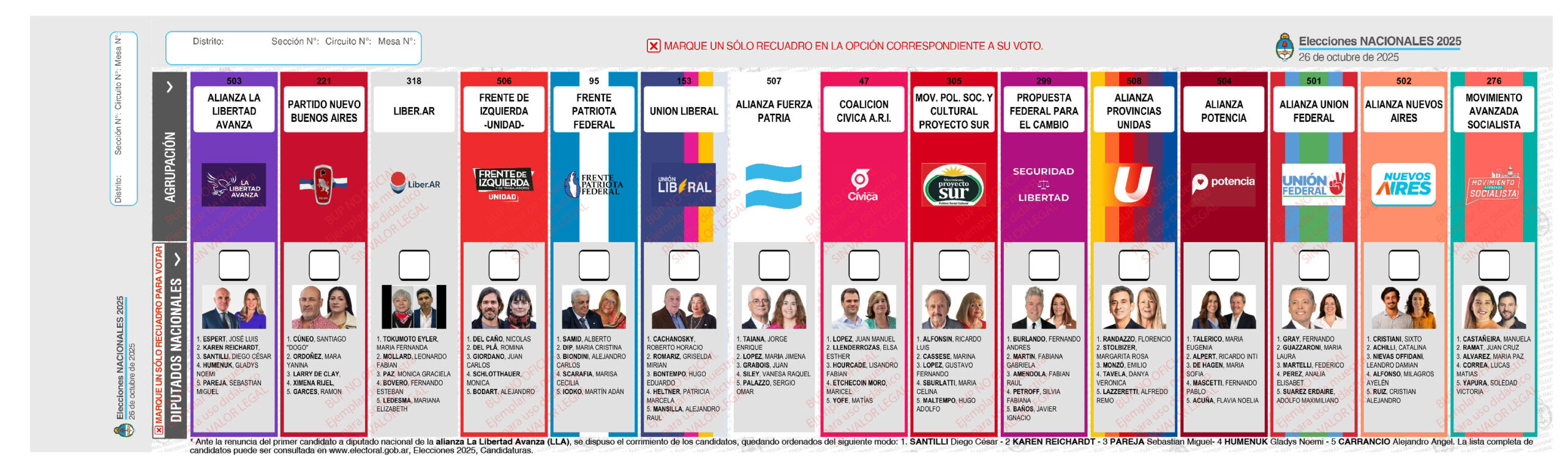 En territorio bonaerense, La Libertad Avanza (LLA) sufrió un duro traspié durante la campaña electoral con la renuncia del diputado nacional en uso de licencia José Luis Espert como primer candidato de la lista violeta. Por esta razón, el primer lugar en la lista libertaria quedó en manos del referente del PRO, Diego Santilli. Sin embargo, a la hora de ir a las urnas, los bonaerenses seguirán viendo la imagen de Espert a la cabeza de la nómina. Este inconveniente se produjo ante la negativa de la Cámara Nacional Electoral (CNE) de hacer lugar al pedido de LLA de reimprimir las boletas con el nuevo primer postulante de ese espacio político. El candidato del frente libertario estará acompañado de la ex vedette Karen Reichardt en los primeros lugares de la lista violeta.