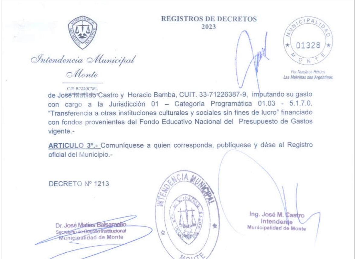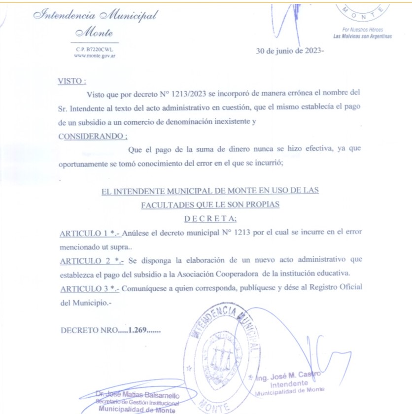 En las últimas horas, el intendente de Monte, José Castro, fue repudiado en redes sociales tras la aparición del Decreto 1213/2023, a través del cual el propio jefe comunal aprueba otorgar un subsidio de $ 405 mil a la asociación cooperadora de la Escuela Primaria n° 12 “Yapeyú” y, en el artículo 2, ordena el pago de $ 184 mil “a favor de la firma Electro Plus Materiales Eléctricos, de José Matildo Castro y Horacio Bamba (…)”.