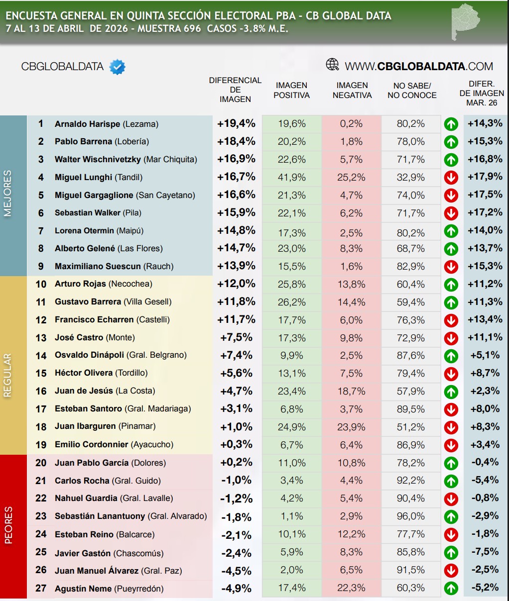 En el ranking específico de la Quinta Sección Electoral, Castro se posicionó en el puesto 13 sobre un total de 27 intendentes evaluados.