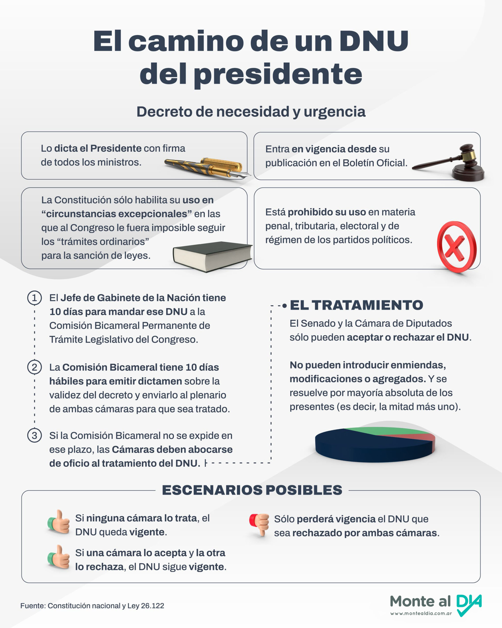 El decreto de necesidad y urgencia es una herramienta prevista en la Constitución nacional que le permite al jefe de Estado legislar “en circunstancias excepcionales“, y su uso está prohibido en materia penal, tributaria, electoral o de régimen de los partidos políticos.