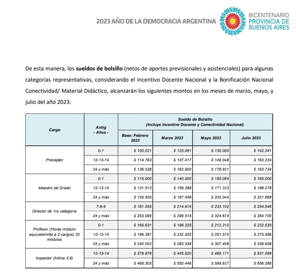 “Eso se va a 165 mil pesos en julio para un docente de jornada simple y a 330 mil para los de jornada completa o que tengan dos cargos“, continuó Baradel y remarcó que “a eso debemos sumar que la mayoría de los docentes ya no tributarán el Impuesto a las Ganancias porque se deducen varios ítems del salario que ya no se cuentan para ese gravamen”.