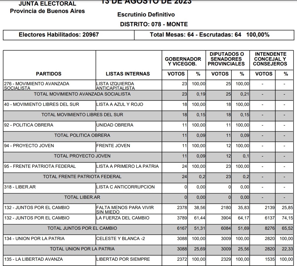A 24 días de las elecciones Primarias, Abiertas, Simultáneas y Obligatorias (PASO) la Junta Electoral de la Provincia de Buenos Aires emitió la resolución aprobando el escrutinio definitivo, según el cual el actual intendente de Monte y candidato a la reelección, José Castro (Juntos por el Cambio), obtuvo 6.137 votos, siendo el aspirante a la intendencia de Monte más votado no solo de la interna, sino de la elección en general.