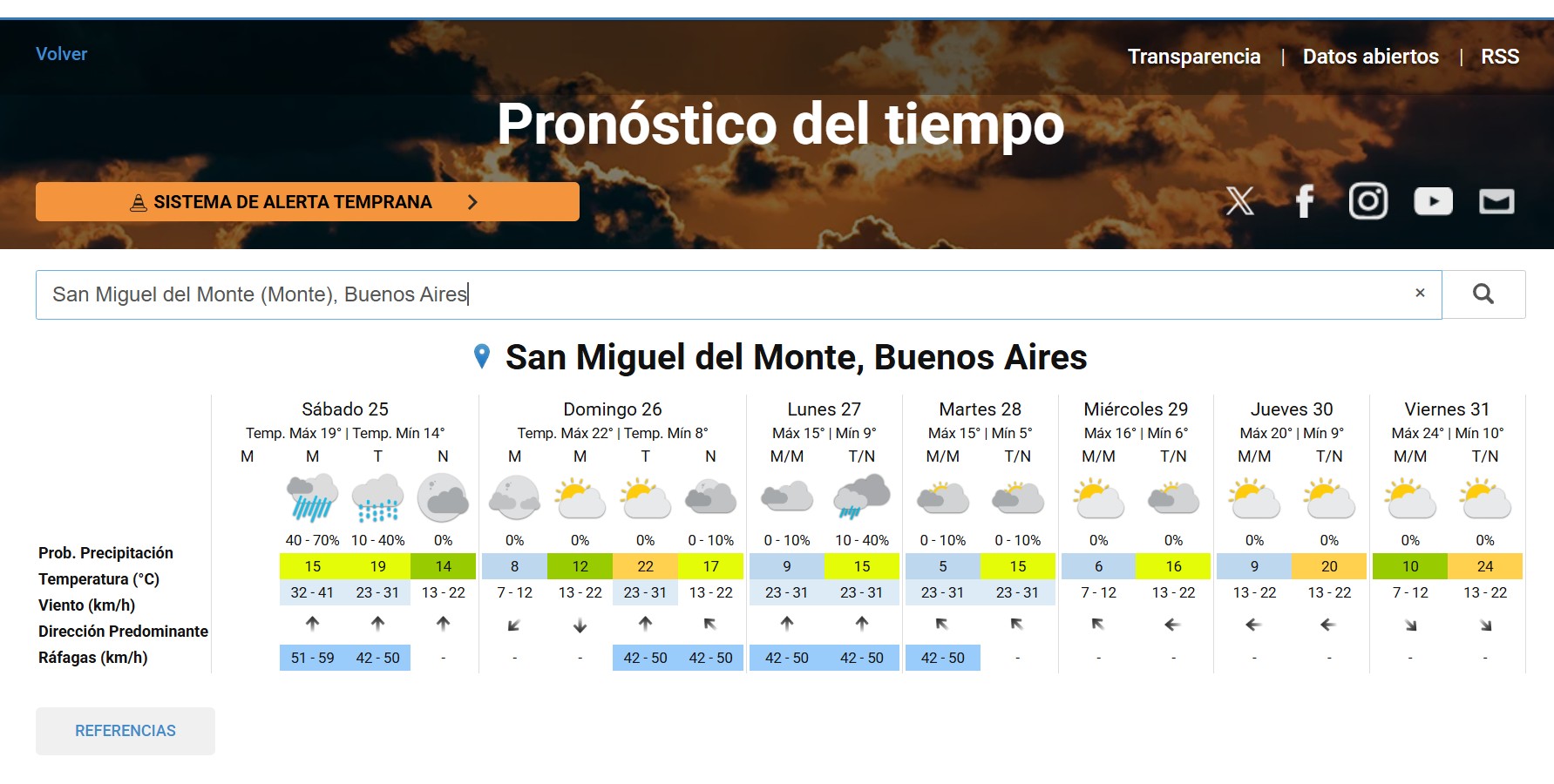 Según el pronóstico extendido del Servicio Meteorológico Nacional (SMN) para San Miguel del Monte, las precipitaciones continuarán con intensidad moderada durante el resto de este sábado, con temperaturas entre 14°C y 18°C y una probabilidad del 80% de lluvias, lo que podría sumar entre 10 y 20 mm adicionales. El domingo 26 se espera una mejora gradual, con cielos parcialmente nublados, mínimas de 12°C y máximas de 20°C, y solo un 30% de chances de chubascos aislados. Para el lunes 27, el tiempo se estabilizará con sol y nubes, temperaturas de 10°C a 22°C y baja probabilidad de precipitación (10%), mientras que el martes 28 y miércoles 29 mantendrán condiciones mayormente soleadas con ascenso térmico, alcanzando máximas de 24°C y 26°C respectivamente, sin alertas vigentes por el momento, aunque se recomienda monitorear actualizaciones dada la saturación reciente del suelo.