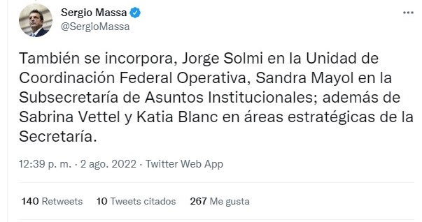 Hasta el momento, Massa confirmó a Raúl Rigo como Secretario de Hacienda, quien será acompañado por Jorge Domper como Subsecretario de Presupuesto y Claudia Balestrini a cargo de la Subsecretaría de Ingresos Públicos.