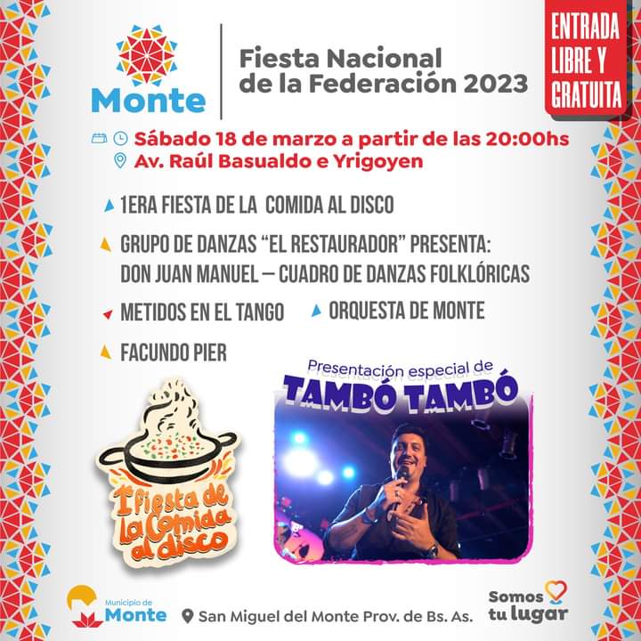 La Fiesta Nacional de la Federación cumple 20 años y el municipio de Monte lo celebra con todo: 1º Fiesta de la Comida al Disco, espectáculos musicales con Tambó Tambó y Lele Lovato, tradicional pericón nacional, gran desfile criollo, Guardia del Monte y Federación Rock.