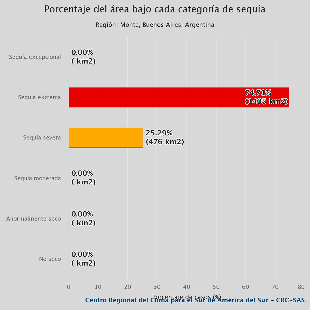 El Partido de Monte cuenta con una superficie de 1890 Km2 (aprox.) de los cuales 1.405 (el 74,71%) se encuentran afectados por una “sequía extrema” producto de la falta de lluvias y del calor extremo. En tanto, los 476 Km2 restantes padecen de una “sequía severa”.
