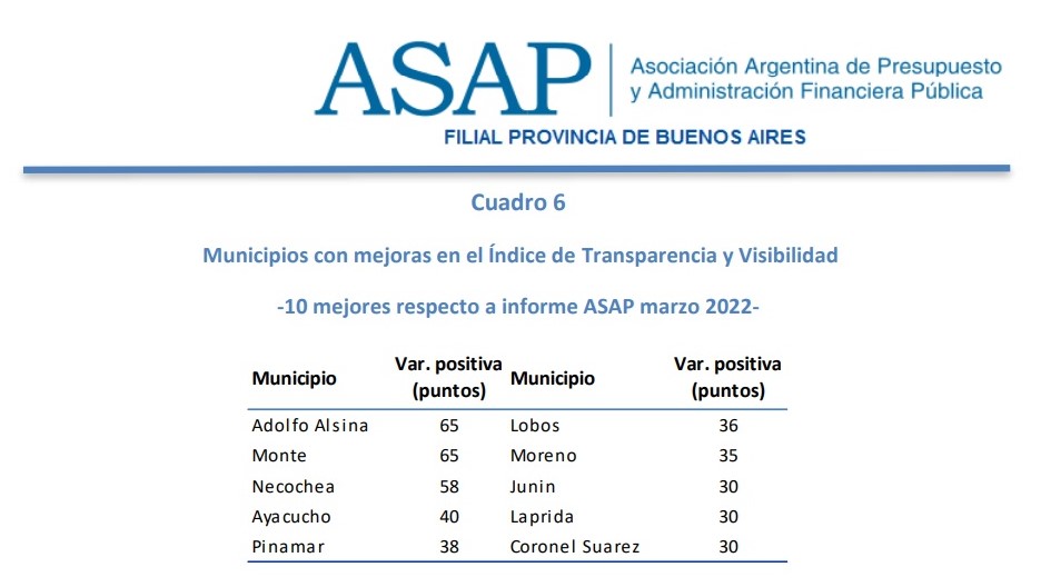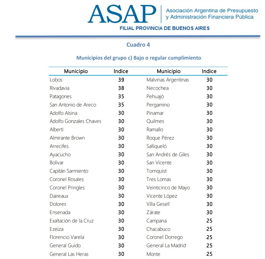 La ASAP realiza monitoreos semestrales en los sitios web oficiales de los 135 municipios bonaerenses, con el fin de “relevar la divulgación de las cuentas públicas de cada uno, y un acceso razonablemente accesible a los datos, de manera tal que permita el seguimiento sistemático y la evaluación de la información fiscal y presupuestaria publicada”.