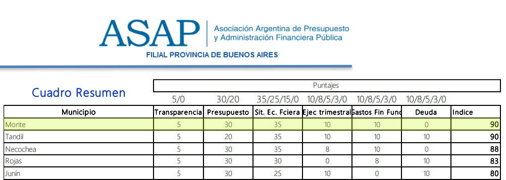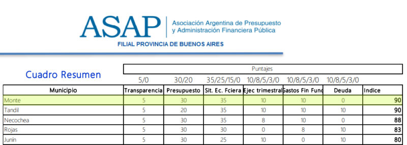 Monte recibió 30 puntos por la publicación del Presupuesto del ejercicio corriente (2022); 35 puntos por la publicación de la situación Económica-Financiera trimestral (con un mes de rezago como máximo); 10 puntos por la publicación de la ejecución presupuestaria trimestral; 10 puntos por la publicación de la ejecución trimestral de Gastos clasificados según finalidad y función (con un mes de rezago cómo máximo); y 5 puntos más por transparencia.