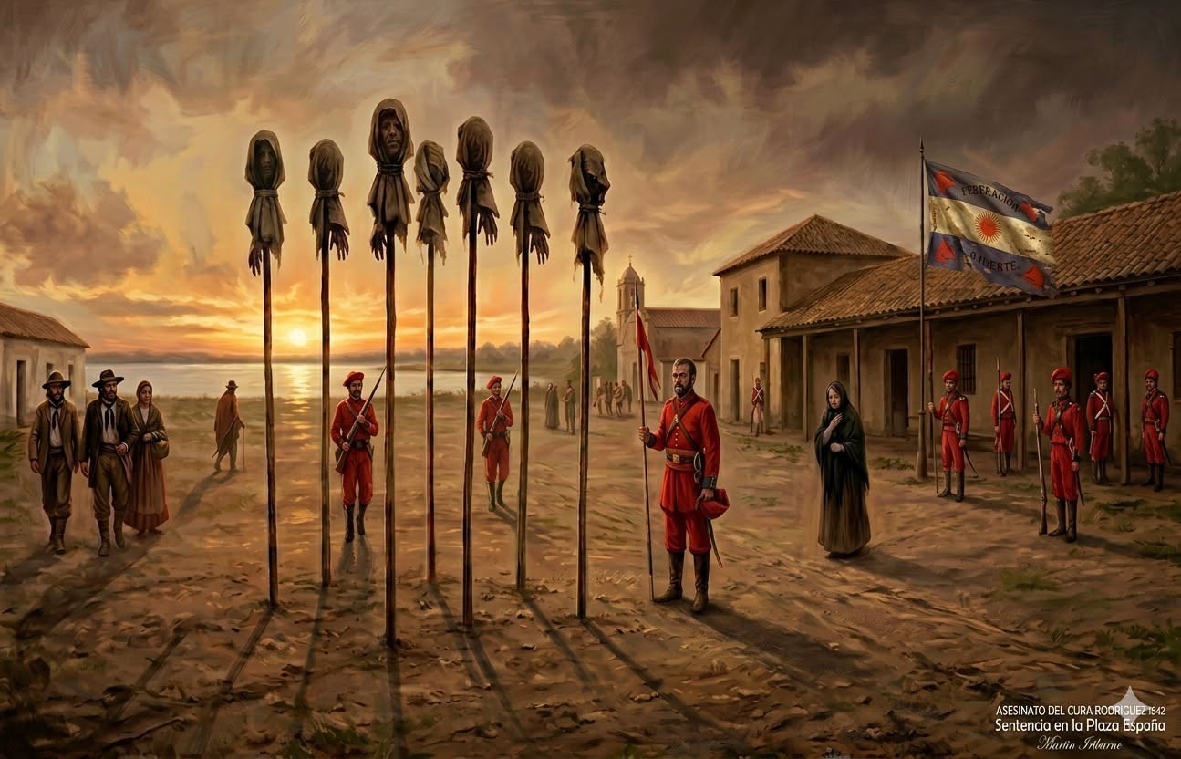 En 1842, la justicia rosista en la frontera no se dilataba en trámites interminables. Se resolvía y se cumplía con celeridad implacable. La sentencia fue clara: los responsables del asesinato del presbítero Pedro Rodríguez eran Ezequiel Patrón, Eustaquio Canaveris, Pedro Suárez, José Galván, Esteban Almirón, Saturnino Fial y Víctor Lozano —siete hombres.